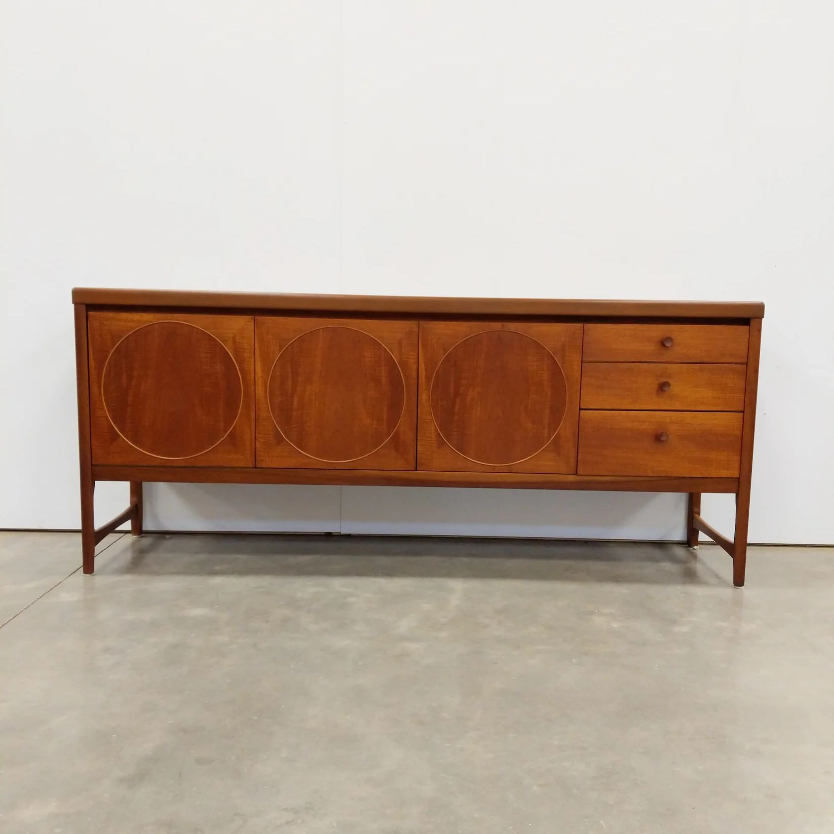 This “circles” teak credenza was produced by Nathan Furniture in the United Kingdom, a company founded in 1916 by Barnett Nathan, who immigrated to London from Russia.