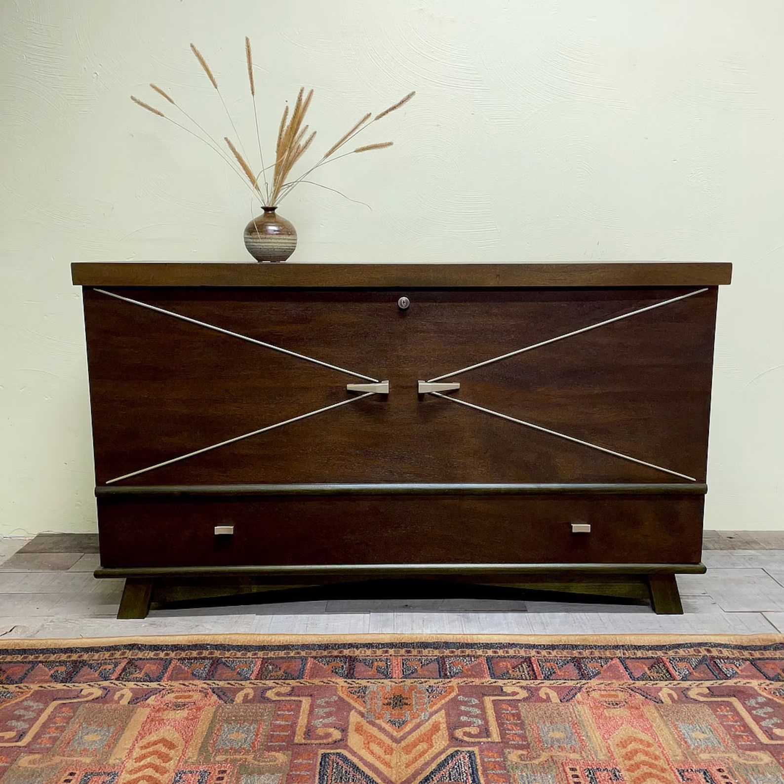 A cedar chest by the now-defunct American company Cavelier with a mossy green stain and a line of antique gold trim.